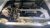 The cockpit features fixed-back bucket seats upholstered in black leather extending to the center console as well as a matching dashboard, silver trim accents, and Elise-branded floor mats. Amenities include air conditioning, traction control, power windows, push-button ignition, an Alpine stereo, and an aftermarket back-up camera.