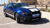 This 2010 Ford Shelby GT500 is finished in Kona Blue Metallic with white racing stripes and graphics, and it is powered by a supercharged 5.4-liter V8 paired with a six-speed manual transmission and a limited-slip differential. Equipment includes a front splitter, a rear spoiler and diffuser, 19″ alloy wheels, a power-adjustable driver seat, dual-zone automatic climate control, cruise control, and a Sync infotainment system with a CD player and Shaker audio. The car was first registered in…