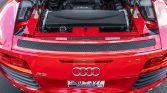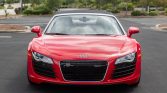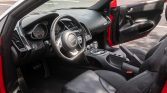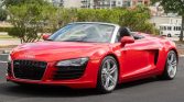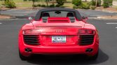 This 2011 Audi R8 Spyder is powered by a 4.2-liter FSI V8 that drives all four wheels through a six-speed R-tronic automated transaxle and is finished in Brilliant Red over black leather. The car is equipped with a powered black convertible soft top, carbon Sigma interior trim, 19″ double-spoke wheels, a speed-activated rear spoiler, xenon headlights, a rearview camera, a Bang and Olufsen sound system, heated power-adjustable seats, and Audi Navigation Plus.