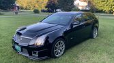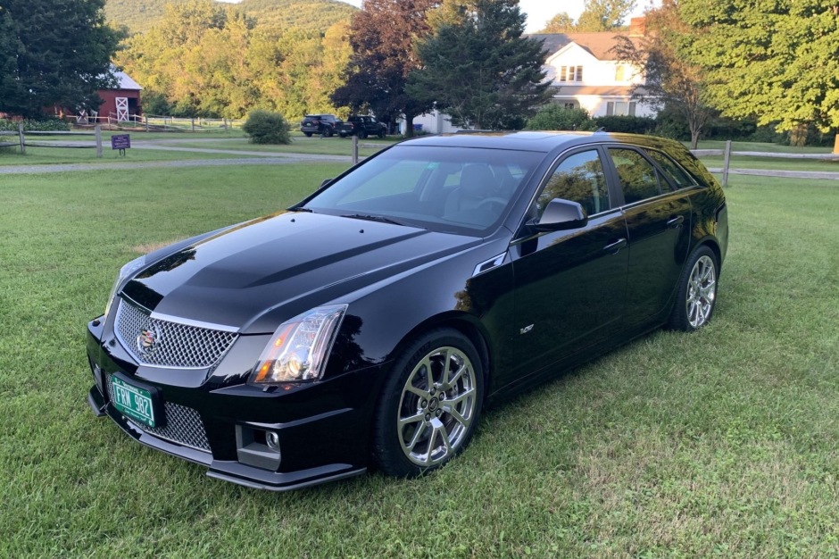 This Cadillac CTS-V wagon is finished in black over black leather and is powered by a supercharged 6.2-liter V8 mated to a six-speed manual transmission and a limited-slip differential. Equipment includes a panoramic sunroof, power-adjustable and climatized Recaro front seats with microsuede inserts, Midnight Sapele wood trim, a Bose sound system, navigation, A power-activated rear liftgate, dual-zone automatic climate control, parking sensors, and 19″ wheels. The car was first sold as a corporate fleet vehicle in Michigan…