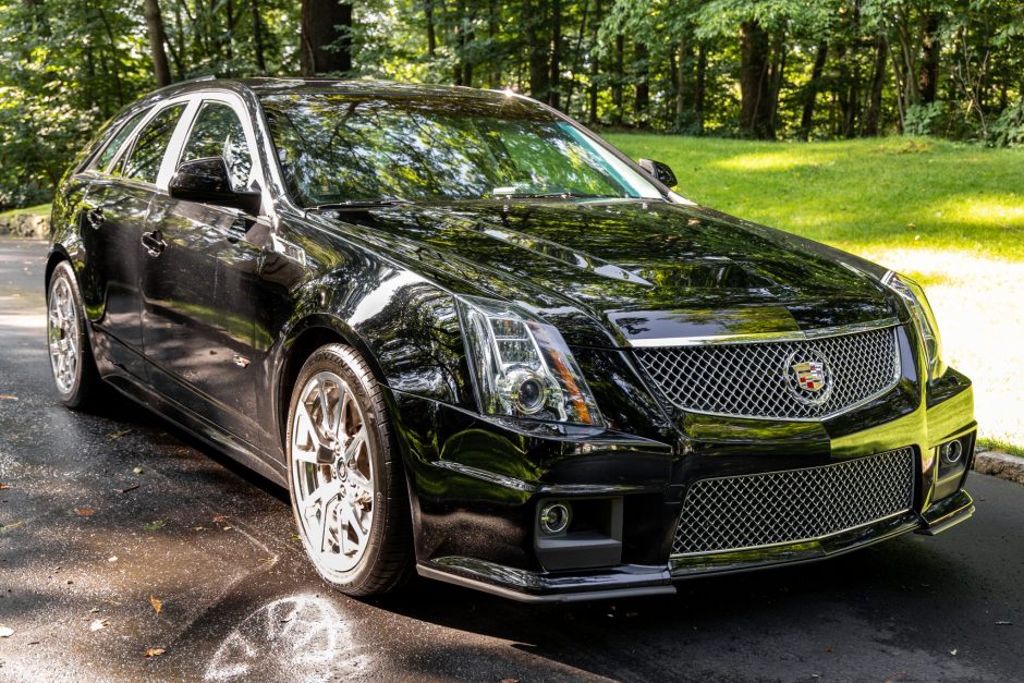 This Cadillac CTS-V wagon is one of fewer than 400 produced for the model year and was purchased new by the seller at Brogan Cadillac in Totowa, New Jersey. The car is finished in black over black leather and is powered by a supercharged 6.2-liter V8 paired with a six-speed manual transmission and a limited-slip differential. Equipment includes Magnetic Ride Control, Brembo brakes, 19″ wheels, a power-activated rear liftgate, a sunroof, ventilated Recaro front seats, a Bose sound system, and dual-zone automatic climate control.