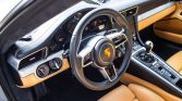 This 2018 Porsche 911 Carrera 4S coupe was fitted with an Akrapovic exhaust system, GTS-sourced turbochargers, BMC air filters, an IPD plenum, a GIAC ECU tune, a Numeric short shifter, an Escort radar detector, 20″ RS Spyder Design alloy wheels, TechArt lowering springs, H&R wheel spacers, and ventilated rear hub carriers. It is finished in GT Silver Metallic over Luxor Beige leather upholstery, it is powered by a twin-turbocharged 3.0L flat-six that drives all four wheels through a seven-speed manual transaxle. The car is further equipped with the Sport Chrono Package, a sunroof, 18-way heated and ventilated adaptive Sport Plus front seats, PCM with navigation, and a Bose sound system.