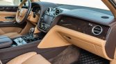 The seating surfaces are trimmed in Camel leather with contrasting stitching. The Front Seat Comfort Specification consists of 22-way power-adjustable front seats with heat, ventilation, and massaging functions as well as position memory, front comfort headrests, and electric height adjustment for the front seatbelts. Mulliner Driving Specification added diamond-quilted seat and door panel inserts, drilled alloy pedals, and embroidered Bentley emblems on the seat backs. The cabin also features multi-zone automatic climate control, a 10-speaker sound system, a quilted rear bumper guard in the rear cargo area, all-weather floor mats, a veneer-finished center fascia panel, and an infotainment system with an 8″ touchscreen, navigation, and Bluetooth connectivity.