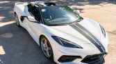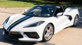 This 2022 Chevrolet Corvette Stingray convertible is optioned from the factory with the Z51 Performance Package, the 3LT Premium Equipment Group, and a Z51 performance suspension with Magnetic Selective Ride Control. Finished in Arctic White with Carbon Flash stripes over Jet Black leather upholstery, it is powered by a mid-mounted 6.2-liter V8 linked with an eight-speed dual-clutch automatic transaxle and a limited-slip differential. The car is further equipped with 19″ and 20″ five-spoke alloy wheels, a power-retractable hardtop, LED headlights, a performance exhaust system, heated and ventilated power-adjustable GT2 bucket seats, a back-up camera, navigation, and a Bose sound system.