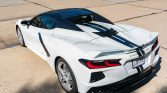 The eighth-generation Corvette debuted for the 2020 model year and is the first to feature a mid-engine layout. This example is finished in Arctic White with dual full-length Carbon Flash racing stripes and is equipped with LED headlights, power-folding side mirrors, front and rear cameras, rear Park Assist back-up sensors, a Z51 rear spoiler, quad exhaust outlets, and a Carbon Flash-finished power-retractable hardtop and nacelles.